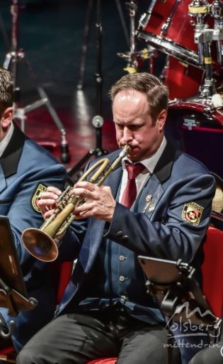Im Anschluss übernahm das Große Blasorchester die Bühne. Mit Werken unter anderem von Jacob de Haan und der bekannten Filmmusik zu Hook von John Williams spannte das Orchester einen musikalischen Bogen von gefühlvoll bis mitreißend. Ein besonderer Moment des Abends war das Solostück Someone Like You, bei dem Nikolas Imöhl an der Solo-Trompete das Publikum begeisterte.